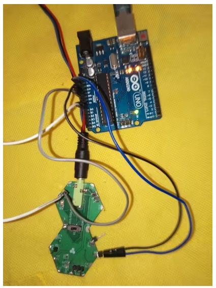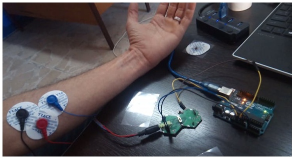 ?使用提供的連接線將Hexabitz EXG Monitor Module連接到Arduino Uno (A0- GND)。