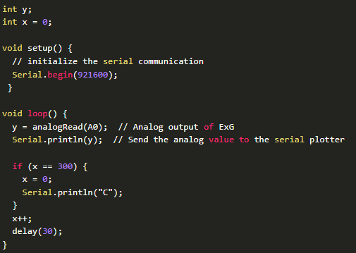 ?‘ y = analogRead(A0); ’從連接到ExG監(jiān)視器的引腳A0讀取模擬值,并將其存儲(chǔ)在變量‘ y ’中。