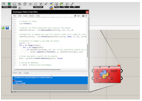 Rhino 8中的Python腳本允許我們執(zhí)行OpenCV。我們?cè)O(shè)法在Grasshopper中安裝了所有的庫(kù)并運(yùn)行腳本,但下一步是將這些點(diǎn)轉(zhuǎn)移到Rhino中,而不是OpenCV預(yù)覽本身。由于時(shí)間原因,我們決定將原型分成兩步:首先,Python單獨(dú)運(yùn)行,生成圖像,然后在Grasshopper中處理圖像。