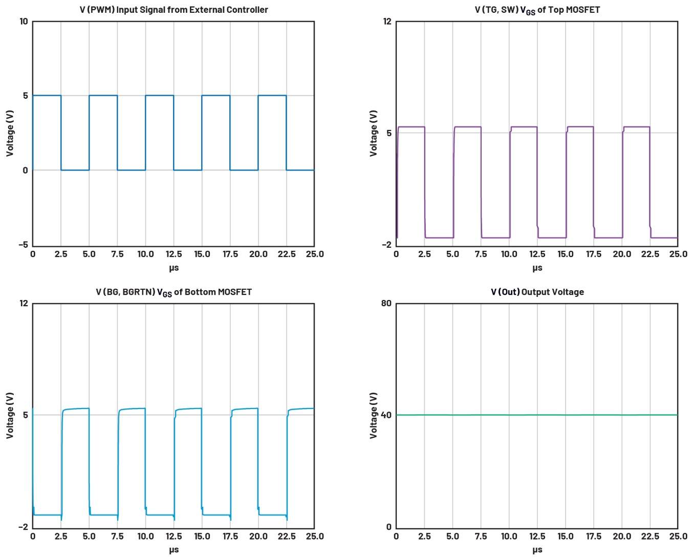 BST-SW和BGVCC-BGRTN電源自舉確保高端和低端驅(qū)動(dòng)器高效運(yùn)行,而無需任何額外的隔離電源電壓,進(jìn)而能夠減少電路板上的元件數(shù)量并降低成本。控制波形和平均輸出電壓結(jié)果如圖2所示。