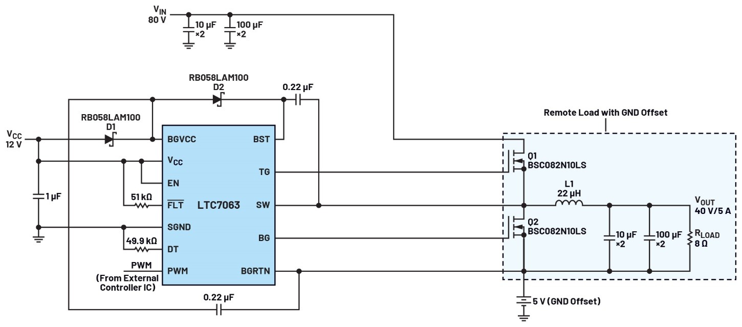 圖1為采用LTC7063設(shè)計(jì)的2:1降壓轉(zhuǎn)換器(帶遠(yuǎn)端負(fù)載)。器件采用高達(dá)80 V的輸入電源供電,輸出電壓為? VIN,最大負(fù)載為5 A。PWM引腳從外部控制器接收三態(tài)邏輯信號,當(dāng)PWM信號達(dá)到上升閾值以上時(shí),高端MOSFET的柵極被驅(qū)動(dòng)至高電平。低端MOSFET與高端MOSFET實(shí)現(xiàn)互補(bǔ)驅(qū)動(dòng)。輸入信號上升閾值與下降閾值之間的滯回解決了MOSFET的誤觸發(fā)問題。在輸入信號的滯回間隔時(shí)間內(nèi),高端和低端MOSFET均被拉低。當(dāng)使能(EN)引腳為高電平時(shí),頂柵(TG)和底柵(BG)輸出均對應(yīng)輸入PWM信號;通過將EN引腳拉至低電平,TG和BG輸出均被拉低。