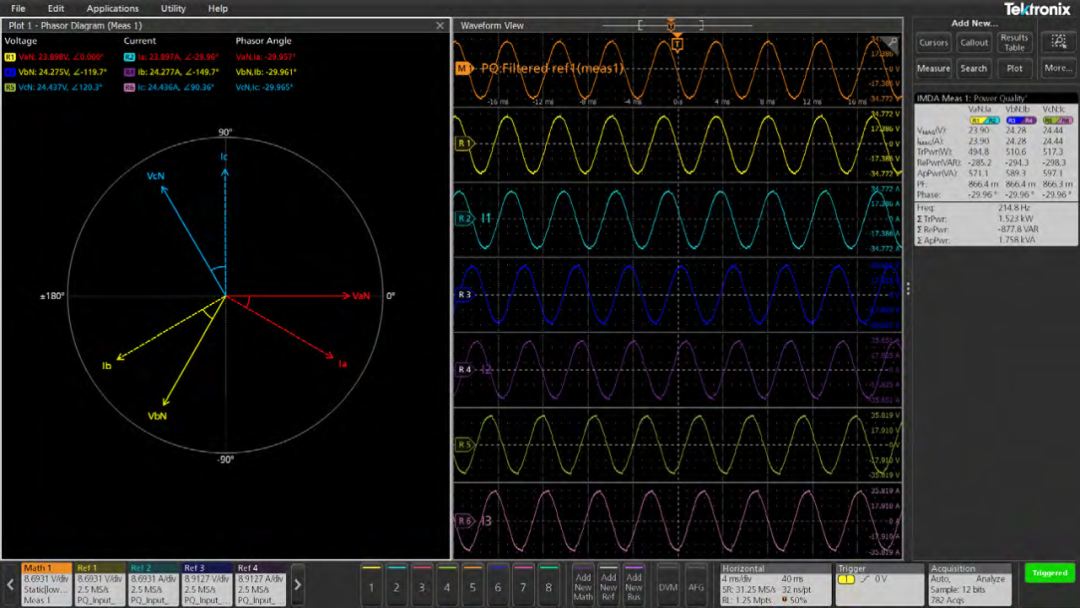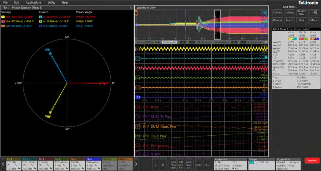 電能質(zhì)量測量可用于確認(rèn)探頭和接線配置是否正確。如果一個或多個功率測量顯示負(fù)讀數(shù),請檢查您的電流探頭,確認(rèn)與負(fù)功率讀數(shù)相關(guān)的通道上的探頭是否連接錯誤。對于三相系統(tǒng),請檢查相量圖。正常情況下,各相電壓應(yīng)基本相同,相位差為120°。