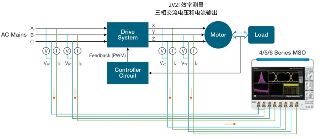 效率測量是指相應(yīng)輸入和輸出電壓和電流對的輸出功率與輸入功率的比值。在5系列和6系列MSO上,輸入和輸出均采用雙功率表法(V1*I1和V2*I2)。如此可以使用八個輸入通道完成三相輸入和輸出功率的完整測量,如圖25所示。