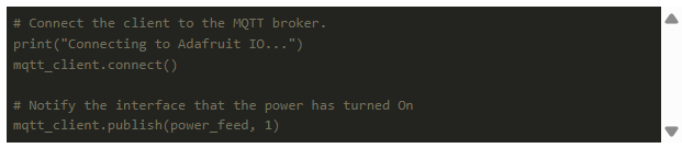 只需使用MQTT.connect()函數(shù)連接到服務(wù)器,這將同時(shí)觸發(fā)我們前面定義的MQTT.connected()函數(shù)。同時(shí),我們將值1發(fā)布到Adafruit IO,以將電源開關(guān)更改為On狀態(tài)。
