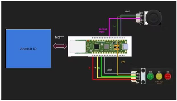 根據(jù)連接圖,我將搖臂模塊的垂直組件連接到GP26上,綠、黃、紅燈分別連接到GP11、13、15上。