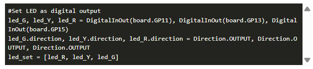 對于紅綠燈模塊,模塊將接收GP11、gp13和gp15的數(shù)字信號,打開模塊上各自的信號燈。因此,我們可以使用CircuitPython的DigitalInOut函數(shù)將端口設(shè)置為數(shù)字信號。我們還需要將方向更改為OUTPUT。
