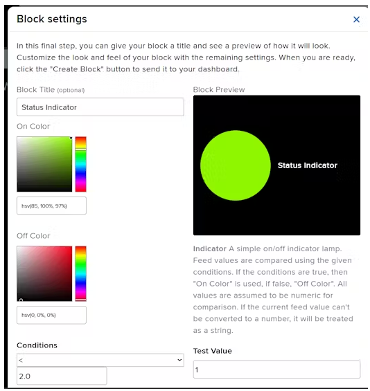 將標(biāo)題和On顏色更改為已綁定到的顏色提要。將條件設(shè)置為等于1.0,這樣只有值1才會打開指示塊。