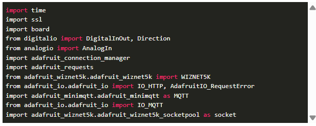 參考Adafruit的MQTT API網(wǎng)站,您可以在MQTT Connection Details小節(jié)的HOST Name中找到broker的參數(shù)。當(dāng)我們將用戶身份驗(yàn)證信息存儲在secrets.py文件中時(shí),我們可以簡單地從secrets JSON中獲取這些信息并加載到MQTT函數(shù)中。將is_ssl設(shè)置為True允許我們連接到8883端口上的Adafruit MQTT Api。最后,我們通過引用前面的代碼為MQTT客戶機(jī)設(shè)置池和上下文。