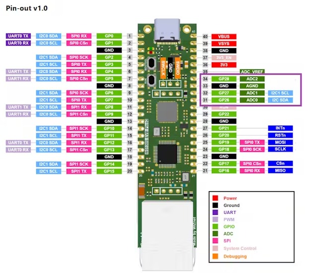 旁注:在W5100S-EVB-Pico 2中,有用于模擬信號和數(shù)字信號的端口。您可以參考以下圖片或訪問Wiznet的官方網(wǎng)站來查找ADC端口