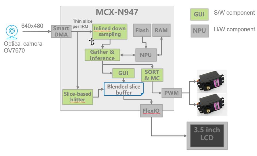 首先,主控芯片的選擇至關(guān)重要,本案例選用了恩智浦的MCXN947芯片,它搭載了雙核Cortex-M33作為主運(yùn)算單元,主頻高達(dá)150 M,能夠滿足復(fù)雜運(yùn)算對處理速度的要求。同時(shí),內(nèi)置了512 K的RAM和2 M的Flash,為數(shù)據(jù)的臨時(shí)存儲和程序的運(yùn)行提供了必要的空間支持。尤為關(guān)鍵的是,芯片集成了一顆NPU (神經(jīng)網(wǎng)絡(luò)處理單元),這一組件在加速運(yùn)行神經(jīng)網(wǎng)絡(luò)模型方面發(fā)揮著不可替代的作用,使得物體追蹤算法能夠在嵌入式平臺有限的資源條件下得以高效執(zhí)行,為整個(gè)系統(tǒng)的穩(wěn)定運(yùn)行和高效運(yùn)算提供了堅(jiān)實(shí)基礎(chǔ)。
