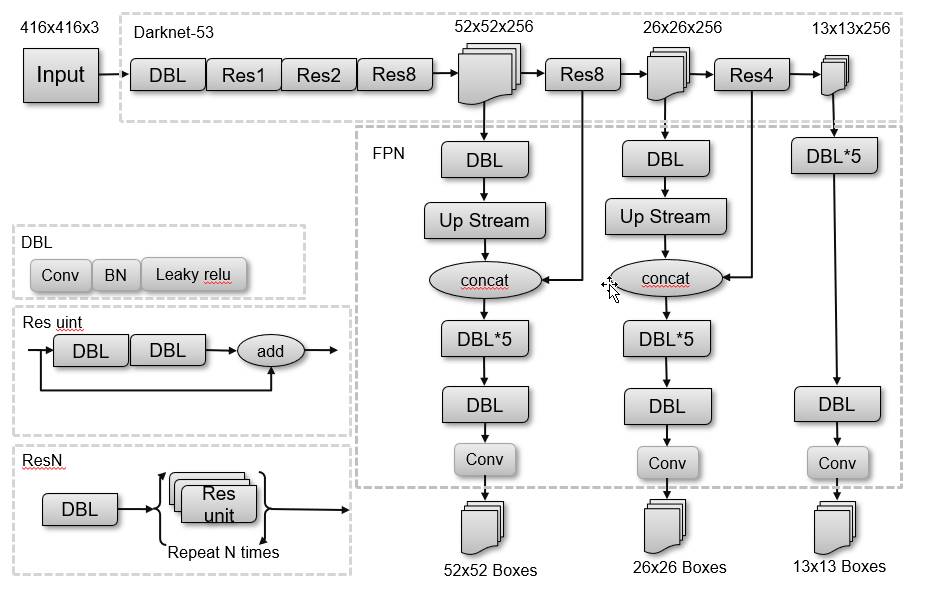 原始網(wǎng)絡(luò)結(jié)構(gòu)由骨干網(wǎng)絡(luò)Darknet53加檢測頭FPN組合而成,結(jié)構(gòu)圖如下圖2所示。