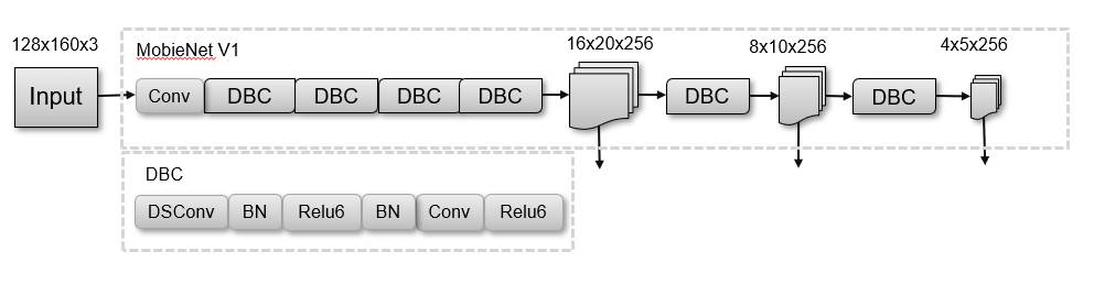優(yōu)化方向從兩個(gè)方面入手:首先縮減輸入分辨率,由416 × 416縮減至128 × 160。然后縮減骨干網(wǎng)絡(luò),改用MobileNet網(wǎng)絡(luò)結(jié)構(gòu),見圖3。