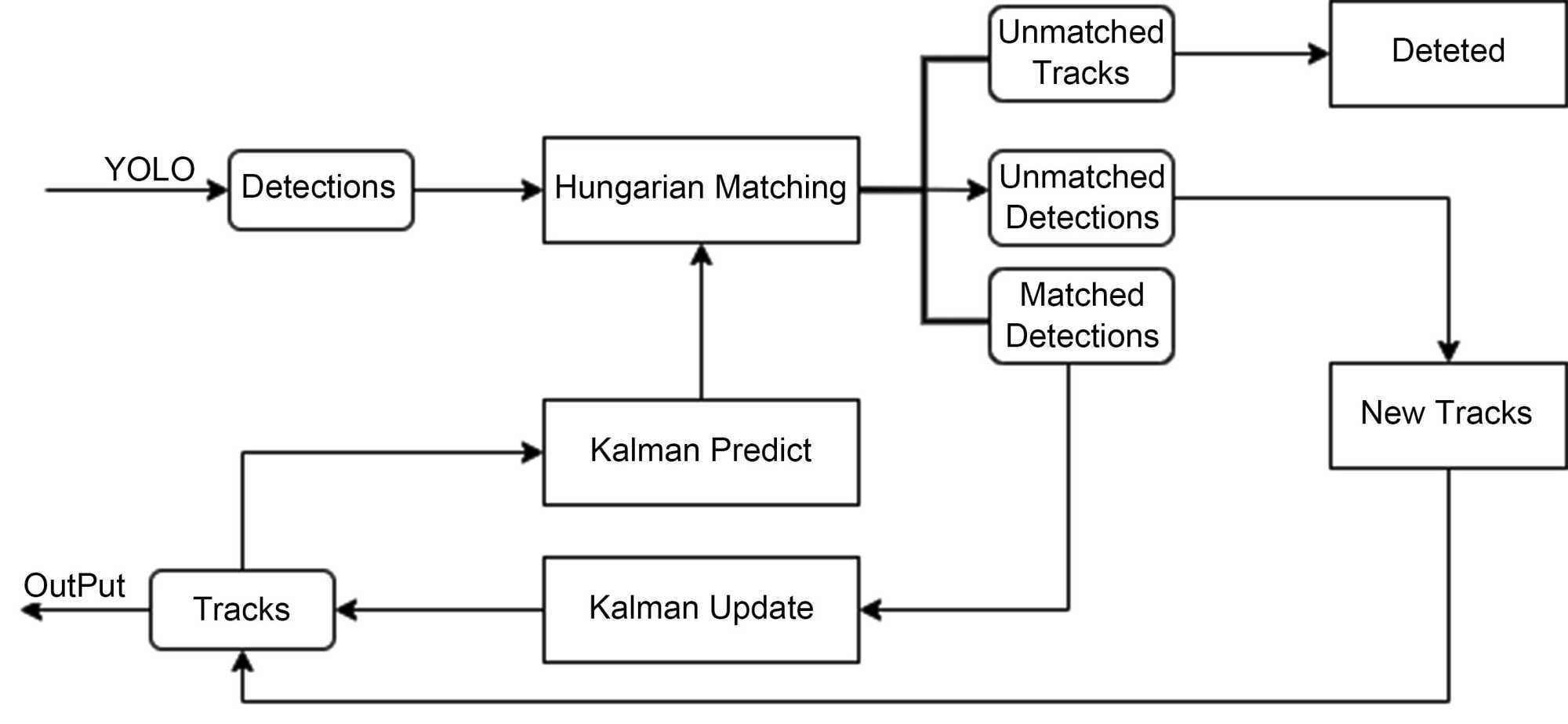 SORT物體追蹤算法可以解決以上兩個(gè)問題。SORT算法主要基于物體的運(yùn)動(dòng)模型進(jìn)行追蹤,對于運(yùn)動(dòng)比較規(guī)律的目標(biāo)能夠取得較好的追蹤效果,其計(jì)算復(fù)雜度較低,能夠滿足實(shí)時(shí)性要求。廣泛應(yīng)用于視頻監(jiān)控,自動(dòng)駕駛以及機(jī)器人視覺等領(lǐng)域。算法流程見圖5。