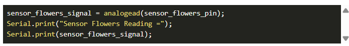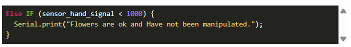 為了檢查FSR傳感器模塊的起始值的變化,我們使用if,在此我們檢查先前存儲(chǔ)的相應(yīng)數(shù)字的傳感器變量的值。三個(gè)數(shù)字的代碼是一樣的,只是每個(gè)數(shù)字的變量的測(cè)試值發(fā)生了變化。在這里,我們也將對(duì)代碼中的變量進(jìn)行檢查,對(duì)花兒的圖形sensor_flowers_signal進(jìn)行分析。
