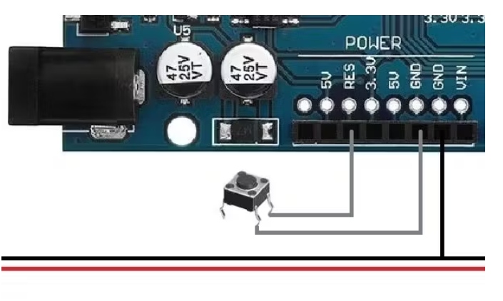 可以向項(xiàng)目中添加幾個(gè)選項(xiàng)。第一種選擇是安裝一個(gè)外部按鈕,連接在GND連接和微控制器的復(fù)位連接之間。通過這種方式,我們將復(fù)位微控制器,它將具有與微控制器的復(fù)位按鈕相同的功能。以下組件應(yīng)添加到電路中: