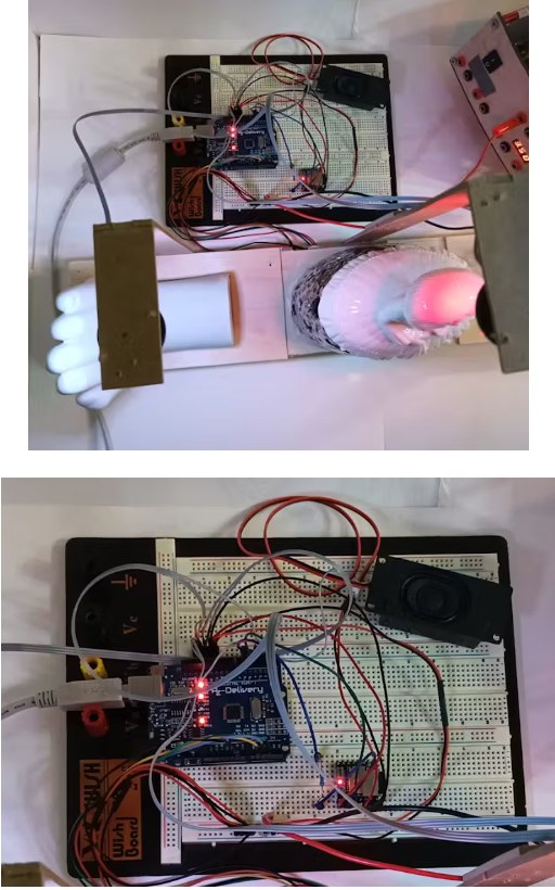 當(dāng)物體就位時(shí),F(xiàn)SR傳感器模塊有一個(gè)高輸出信號(hào)顯示在串行監(jiān)視器上。LED環(huán)用白光照亮人物或物體。一旦其中一個(gè)對(duì)象被操作,F(xiàn)SR傳感器模塊的輸出信號(hào)下降,被操作對(duì)象的LED環(huán)亮紅燈并發(fā)出報(bào)警聲音。即使同一物體或其他物體再次定位在該位置,警報(bào)仍然存在。