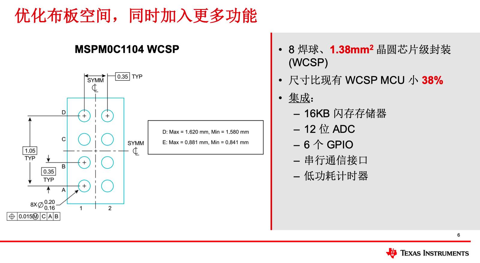 MSPM0C1104采用8焊球WCSP封裝,尺寸僅為1.38平方毫米,較業(yè)內(nèi)同類(lèi)產(chǎn)品縮小了38%。這一突破得益于TI在封裝技術(shù)上的深厚積累。WCSP(Wafer-Level Chip-Scale Package)技術(shù)通過(guò)在晶圓級(jí)直接完成布線和焊球布局,省去了傳統(tǒng)封裝的外部塑封工藝,不僅大幅縮小了封裝體積,還降低了生產(chǎn)成本。Yiding在回答媒體提問(wèn)時(shí)提到,TI在多條產(chǎn)品線的量產(chǎn)經(jīng)驗(yàn)中不斷優(yōu)化WCSP技術(shù),最終實(shí)現(xiàn)了這一超小型封裝的量產(chǎn)突破。