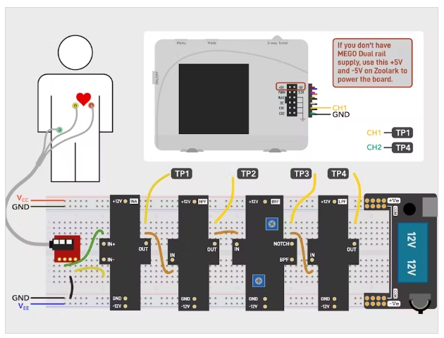 模塊互連:按順序連接模塊-首先捕獲心電信號(hào),然后分階段過(guò)濾掉不需要的頻率。每個(gè)模塊的輸出直接饋送到下一階段,確保干凈的信號(hào)路徑。