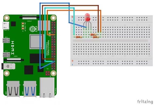 查看接線圖:參考以下接線圖(為清晰起見省略了超聲波接線),了解如何將RGB LED連接到樹莓派上,使用面包板和電阻來控制電流: