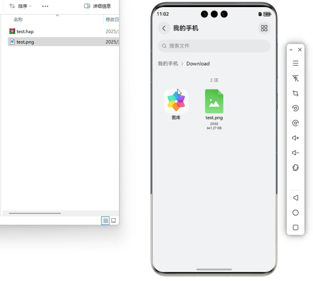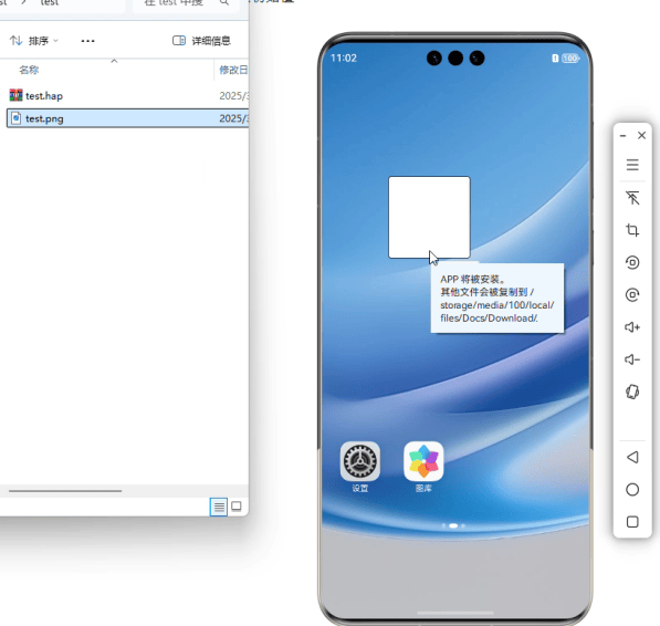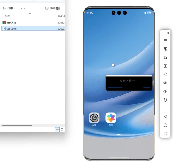 在文件傳輸方面,模擬器同樣提供了便捷的操作體驗。開發(fā)者可以將圖片、文檔等文件直接拖拽至模擬器UI界面,實現(xiàn)文件的快速上傳,而無需像在真機上那樣先開啟文件傳輸功能,然后從電腦端手動復制、粘貼或執(zhí)行hdc file send命令。