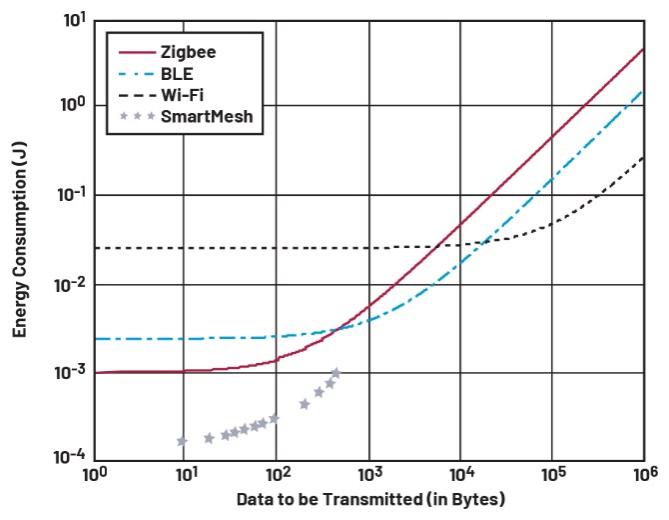 表3中顯示的傳感器以1%的占空比運(yùn)行,其中Voyager 3的最大有效載荷為90字節(jié),AI版本的最大有效載荷為510字節(jié)。圖4(改編自Shahzad和Oelmann3)顯示,對(duì)于500字節(jié)到1000字節(jié)的有效載荷,BLE消耗的能量少于Zigbee和Wi-Fi。因此,BLE非常適合AI使用場景。SmartMesh的功耗非常低,在90字節(jié)或有效載荷更少的情況下(如Voyager 3傳感器中使用的)尤為如此。網(wǎng)站上提供的SmartMesh功耗和性能估算工具可用于估算SmartMesh能耗。經(jīng)實(shí)驗(yàn)驗(yàn)證,SmartMesh功耗估算工具的精度為87%至99%,具體取決于傳感器是路由節(jié)點(diǎn)還是葉節(jié)點(diǎn)。