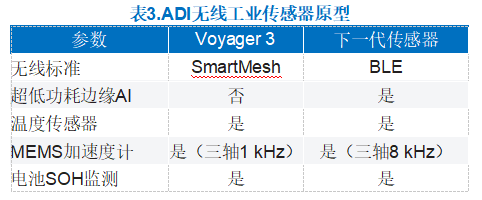 表3概述了ADI公司的Voyager 3無線振動(dòng)監(jiān)測平臺(tái)和下一代無線狀態(tài)監(jiān)控傳感器。Voyager 3采用SmartMesh模塊(LTP5901-IPC)。支持AI的振動(dòng)傳感器(仍在開發(fā)中)采用BLE微控制器(MAX32666)。兩種傳感器均包含溫度和電池健康狀態(tài)(SOH)傳感器。Voyager 3和AI版本傳感器使用ADI MEMS加速度計(jì)(ADXL356、ADXL359)來測量工業(yè)設(shè)備的振動(dòng)幅度和頻率。通過FFT頻譜可以識(shí)別出振動(dòng)幅度和頻率的增加,這可能是電機(jī)不平衡、未對(duì)準(zhǔn)和軸承損壞等故障的征兆。