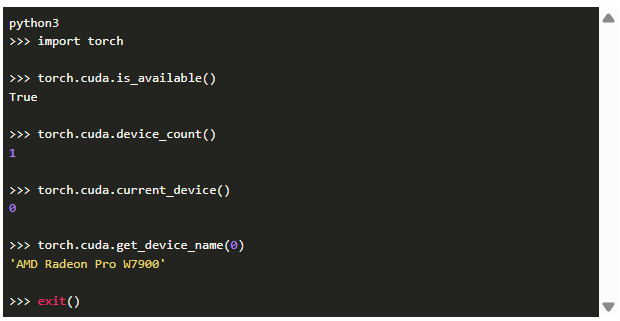 我們也可以通過(guò)PyTorch驗(yàn)證AMD GPU的支持,如下面的python會(huì)話: