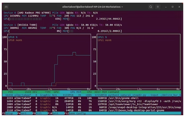 下面的屏幕截圖顯示了nvtop的輸出。在我的系統(tǒng)中,我有一個(gè)AMD Radeon Pro W7900 GPU (48GB),以及一個(gè)較小的NVIDIA T400 GPU (4GB)。