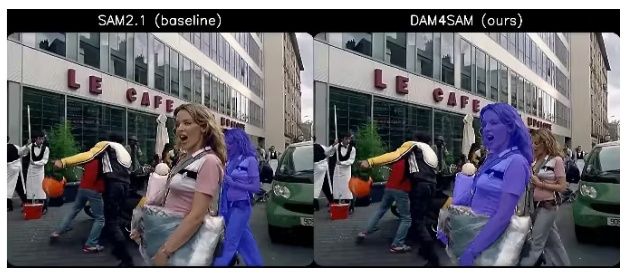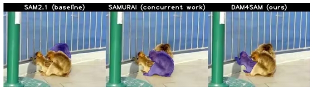 還有其他的解決方案提供了類似的跟蹤改進(jìn),其中一些聲稱更好的跟蹤,即使是相同的對(duì)象(如:干擾)。其中一個(gè)解決方案是用于SAM 2.1的干擾感知內(nèi)存,或DAM4SAM。