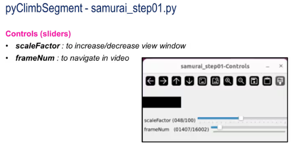 “samurai_step01 - Controls”窗口允許你調(diào)整視頻內(nèi)容的大小(scaleFactor),并在視頻中導(dǎo)航(frameNum)。