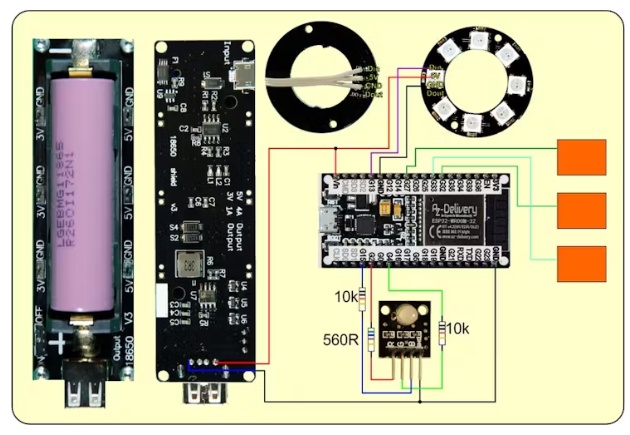 我們將LED環(huán)的信號線連接到GPIO13上。戒指有8個led,同樣你也可以使用一個有12個led的戒指。當然,它也會更快地耗盡電池。使用8系列環(huán),電流消耗在40mA到250ma之間。當使用2200毫安時,根據亮度設置的不同,負載足夠使用大約8小時。