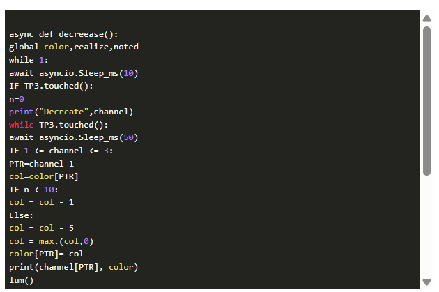 我們想用三個傳感器板來控制新led。通過GPIO33的觸摸板進行顏色選擇。有五個通道:開/關、紅、綠、藍和明/暗。強度增加到GPIO32,降低到GPIO27。這三個活動的操作在后臺以三個函數(shù)并行運行。這是通過asyncio模塊實現(xiàn)的。