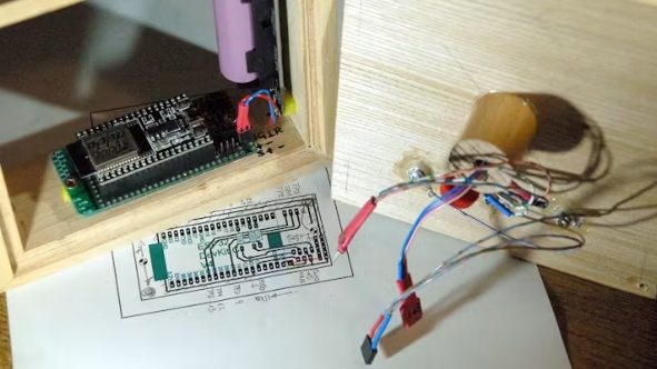 作為能源供應,我選擇了18650型的鋰離子電池,加上一個帶有加載部分和5V輸出的電池所有者。我在USB A插座的連接旋轉上焊接了我的電路的供應線。這樣我就不用USB插頭了,仍然可以使用板上的機械開關。它將指向房屋朝向地面,以及在圖2中板子上端的加載插座。