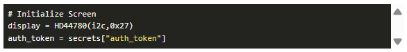首先使用庫(kù)設(shè)置顯示對(duì)象,并從secrets py文件中讀取驗(yàn)證令牌。使用地址0x27或從I2C.scan()函數(shù)打印的地址。