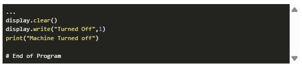 最后,當(dāng)電源設(shè)置為False后,我清除了顯示,并在LCD屏幕上寫了一條關(guān)機(jī)消息,通知用戶設(shè)備已關(guān)機(jī)。