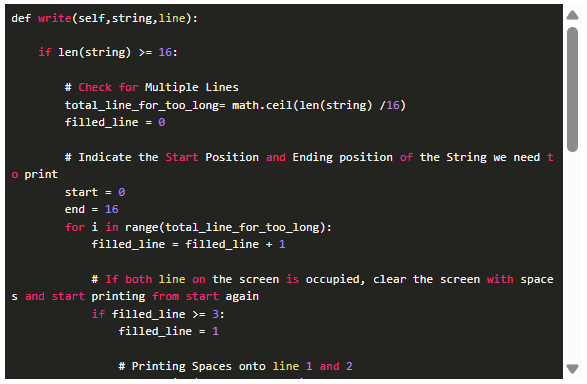 最后,我改變了寫函數(shù)的工作方式。在原始函數(shù)中,如果字符串超過(guò)16個(gè)字符,我們應(yīng)該寫入的行將不顯示剩余的字符。因此,我改變了庫(kù)的工作方式,這樣它就可以顯示每個(gè)字符,因?yàn)楦枨拿滞ǔ:荛L(zhǎng)。