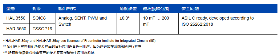 ?新傳感器包括單芯片版本(HAL 3550)和雙芯片版本(HAR 3550),配備模擬(線性、比率)和數(shù)字(PWM、SENT 和開(kāi)關(guān))輸出接口