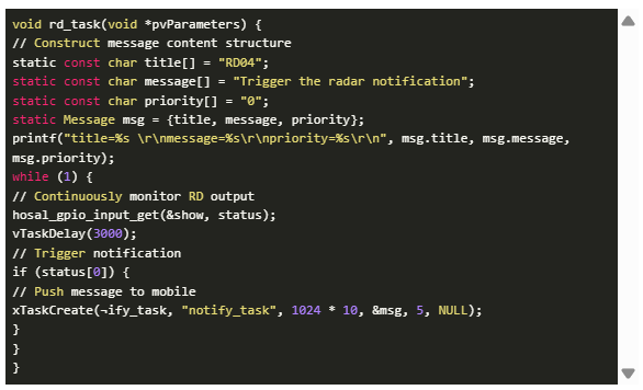 當雷達檢測到障礙物時,輸出高電平信號,并向個人手機發(fā)送通知。