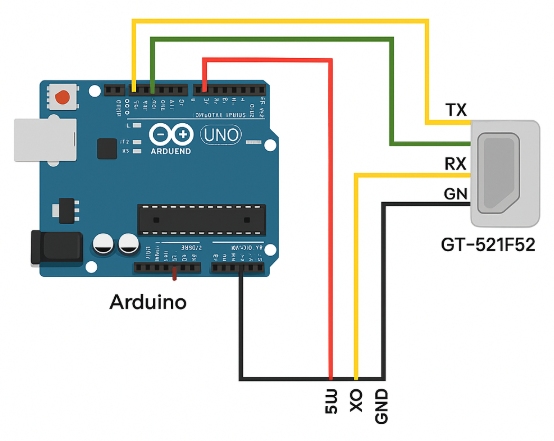 1. 按照圖中所示的布線布局,使用正確的引腳(TX, RX, VCC, GND)將指紋傳感器連接到微控制器。