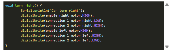 如果我們不希望旋轉(zhuǎn)如此突然,當我們調(diào)用激活電機時,我們必須使用digitalWrite(enable_name_motor, state),我們必須將參數(shù)狀態(tài)設(shè)置為LOW設(shè)置。這將允許我們禁用電機,無論電機觸點的狀態(tài)如何,它都不會向任何方向旋轉(zhuǎn),并且會在另一個電機繼續(xù)旋轉(zhuǎn)時停止,因此旋轉(zhuǎn)將在停止的輪子上。