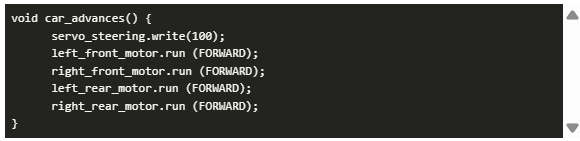 使我們的汽車以直線前進的方法將用于轉(zhuǎn)向的伺服電機定位為100度角,并使用指令motor_name.run(forward)激活它,以激活微控制器的引腳,使L293D電機屏蔽模塊為正確的電機提供正確的電壓,使車輪向前轉(zhuǎn)動。提醒一下,只要超聲波傳感器測量到物體的距離大于或等于我們設(shè)置的距離,這個方法就會運行。