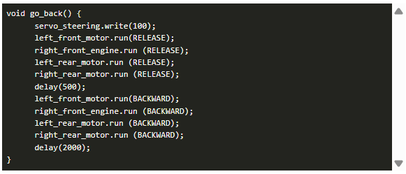 要調(diào)用的最后一個方法是go_back(),如果前面三個條件都不滿足,則執(zhí)行該方法。當車輛進入前方障礙物小于1米,側(cè)面障礙物小于20厘米的區(qū)域時,將執(zhí)行以下命令:將車輛定位成100度角,并命令停止發(fā)動機。motor_name.run(RELEASE),暫停500毫秒,然后使用命令motor_name.run(BACKWARD)停止2秒,這與方法delay(2000)的最后一行相同,對應(yīng)于時間設(shè)置。
