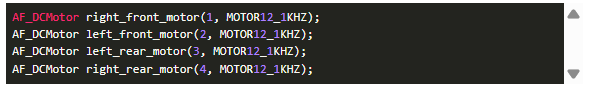 “4通道L293D電機驅(qū)動器屏蔽”是我們需要配置和實現(xiàn)的最后一個組件,因此我們可以管理電機的控制。我們需要為電機控制的每個輸出通道創(chuàng)建一個庫對象。在我們的例子中是4個通道。作為參數(shù),我們必須指定端口號和工作信號的頻率。根據(jù)微控制器的數(shù)據(jù)表,端口3和4僅以1KHz的頻率工作,因此我們將所有端口配置為此頻率。此外,在這個更新速度下,功耗更低,所以我們可以節(jié)省電池。