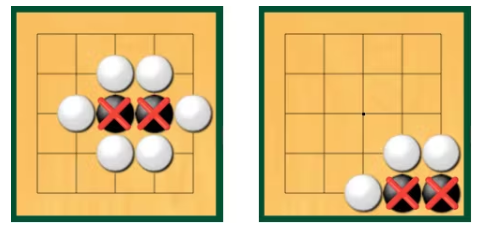 圍棋是一種基于地域的游戲。在職業(yè)圍棋中,獲勝者取決于被自己的棋子包圍的區(qū)域的大小,在沒有棋子的地方。然而,EmoGo遵循“純圍棋”的規(guī)則,即根據(jù)每個棋手在棋盤上的棋子數(shù)量來決定勝負。玩家只能放置石頭;一旦放置,它們就無法移動。兩名玩家最終會在棋盤上擁有相同數(shù)量的石頭。然而,如圖3所示,有特定的情況:如果圍棋棋子完全被對手的棋子或棋盤邊緣包圍,則必須將其移除。在EmoGo中,獲勝的關(guān)鍵是移除對手的棋子,同時確保自己的棋子留在棋盤上。