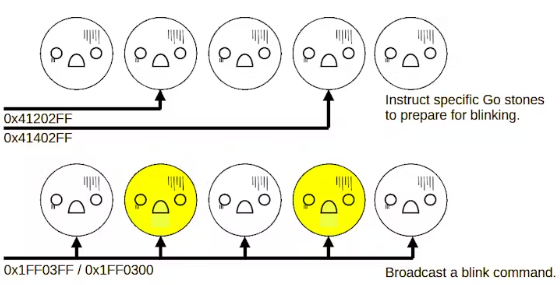 ?然后游戲控制器廣播消息0x1FF03FF(開)和0x1FF0300(關(guān))。只有處于blink-ready狀態(tài)的單板模塊(0x12和0x14)響應(yīng)這些命令,其他模塊都忽略這些命令。這使得同步眨眼只是選定的圍棋石頭。