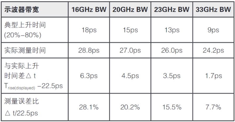 從下表可以看到,帶寬越高,上升時(shí)間的測(cè)量誤差就越小。