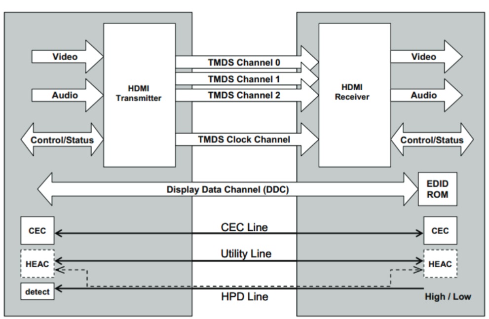 HDMI接口可以劃分為四種類型:Source(源設(shè)備)、Sink(接收設(shè)備)、Cable(線纜)和Repeater(中繼器)。為了保證這些設(shè)備之間的良好兼容性,規(guī)范對(duì)電氣信號(hào)提出了信號(hào)完整性的要求。HDMI接口使用TMDS(Transition Minimized Differential Signaling,最小化傳輸差分信號(hào))編碼技術(shù),包含4對(duì)TMDS差分信號(hào),其中TMDS.Clock.channel作為獨(dú)立的時(shí)鐘信號(hào),用于同步和信號(hào)采集;TMDS.channel.0/1/2作為數(shù)據(jù)通道,用來(lái)傳輸視頻和音頻數(shù)據(jù)。例如,HDMI 2.0定義了每個(gè)通道最高6Gbps的速率,接口的總帶寬最高可達(dá)18Gbps,能夠滿足4Kp60Hz所需的17.82Gbps帶寬。