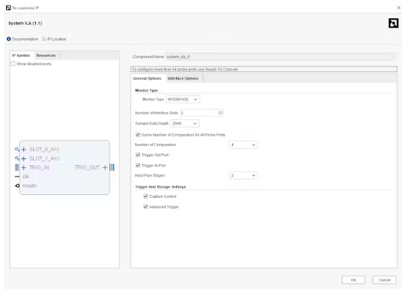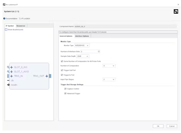 按如下方式配置System ILA屬性;啟用其觸發(fā)輸入和輸出端口。這將使我們能夠與Vitis Unified的軟件開發(fā)進行交叉探索。