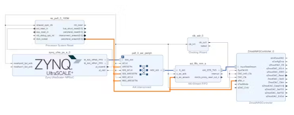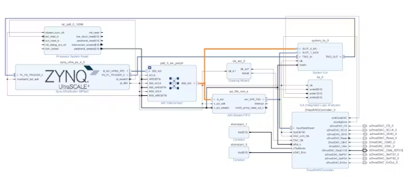ZMod AWG需要一個軸流輸入,而處理系統(tǒng)有一個AXI4輸出。然而,Vivado能夠實現(xiàn)必要的內存映射到流轉換架構。連接ZMod AWG輸入數(shù)據流端口到處理系統(tǒng)的h0 - fpd端口。