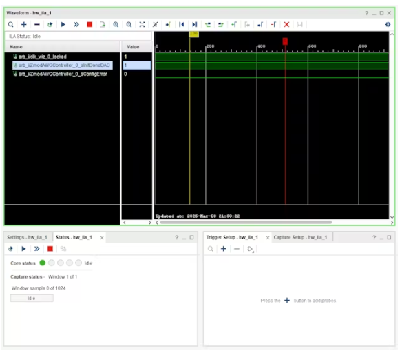 在Vivado中,打開硬件管理器,并在ILA1上,仔細檢查時鐘向導是否被鎖定并且DAC已初始化。由于這些是靜態(tài)信號,我們可以立即觸發(fā)ILA。